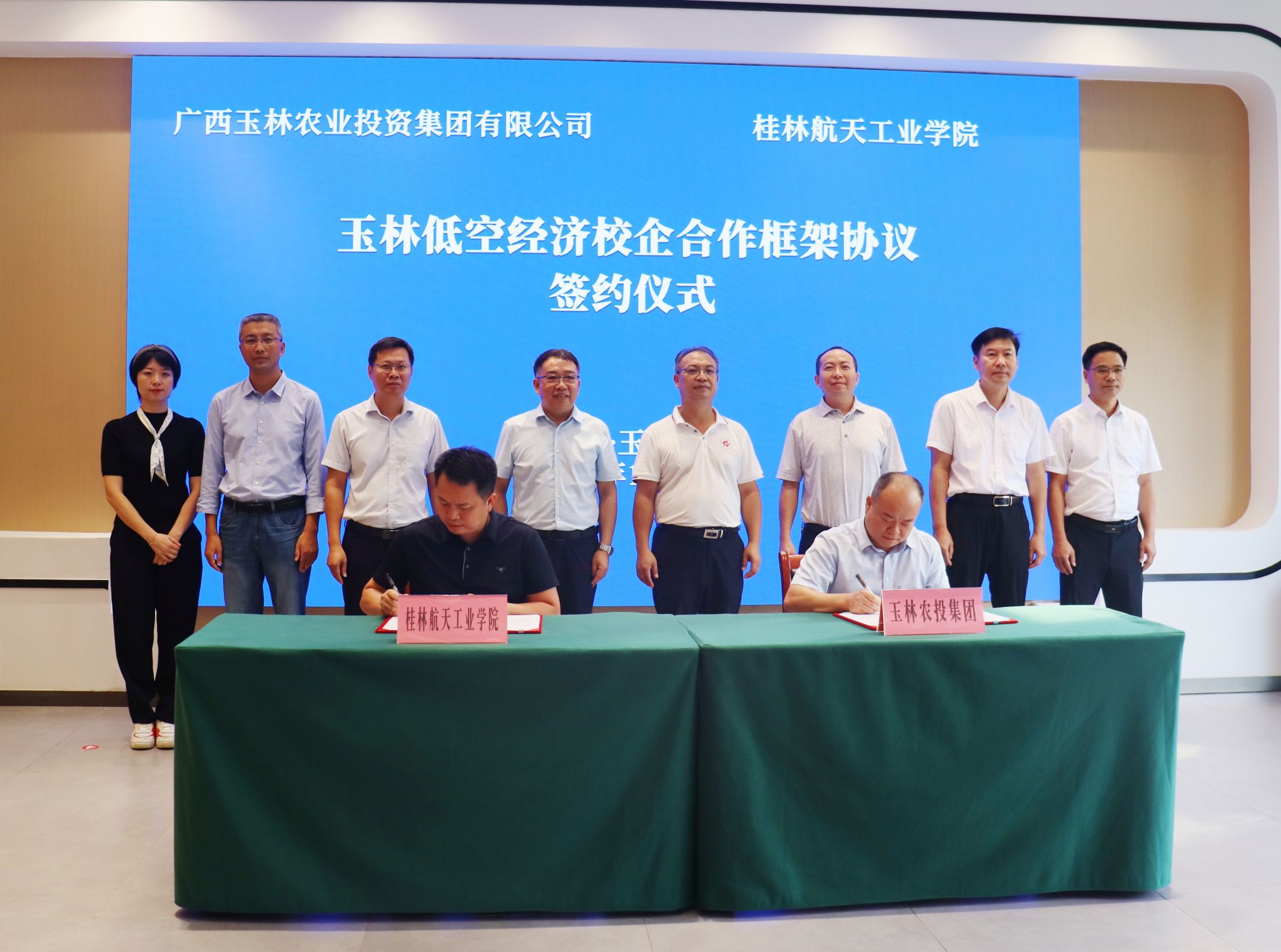 10月17日,学校与玉林农投集团签约低空经济校企合作框架协议签约仪式在广西玉林农业投资集团有限公司举行。玉林市委副书记邓国忠,玉林农投集团党委书记、董事长杨富源,董事、总经理吕祖荣,学校副校长张烈平出席签约仪式,玉林市发改委、玉林市国资委、玉林市科技局、玉林市投资促进局、玉林市市场监管局、玉林市农业农村局等部门领导,航空服务与旅游管理学院院长林朝阳、科技处副处长郭述锋、广西(桂林)低空旅游研究院院长罗敏参加签约仪式。