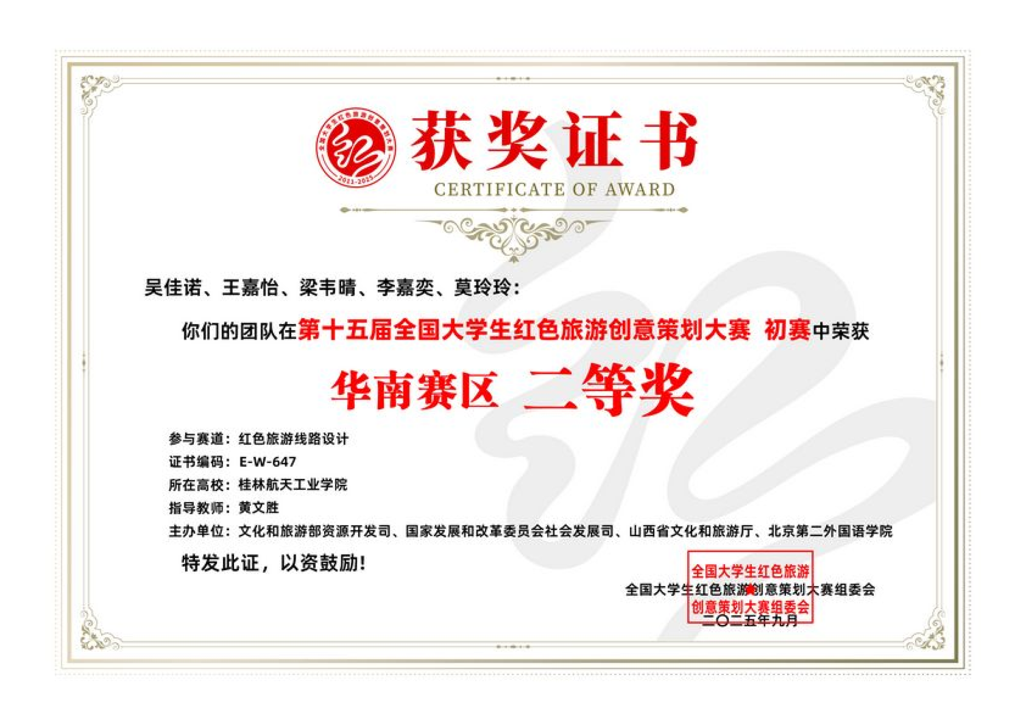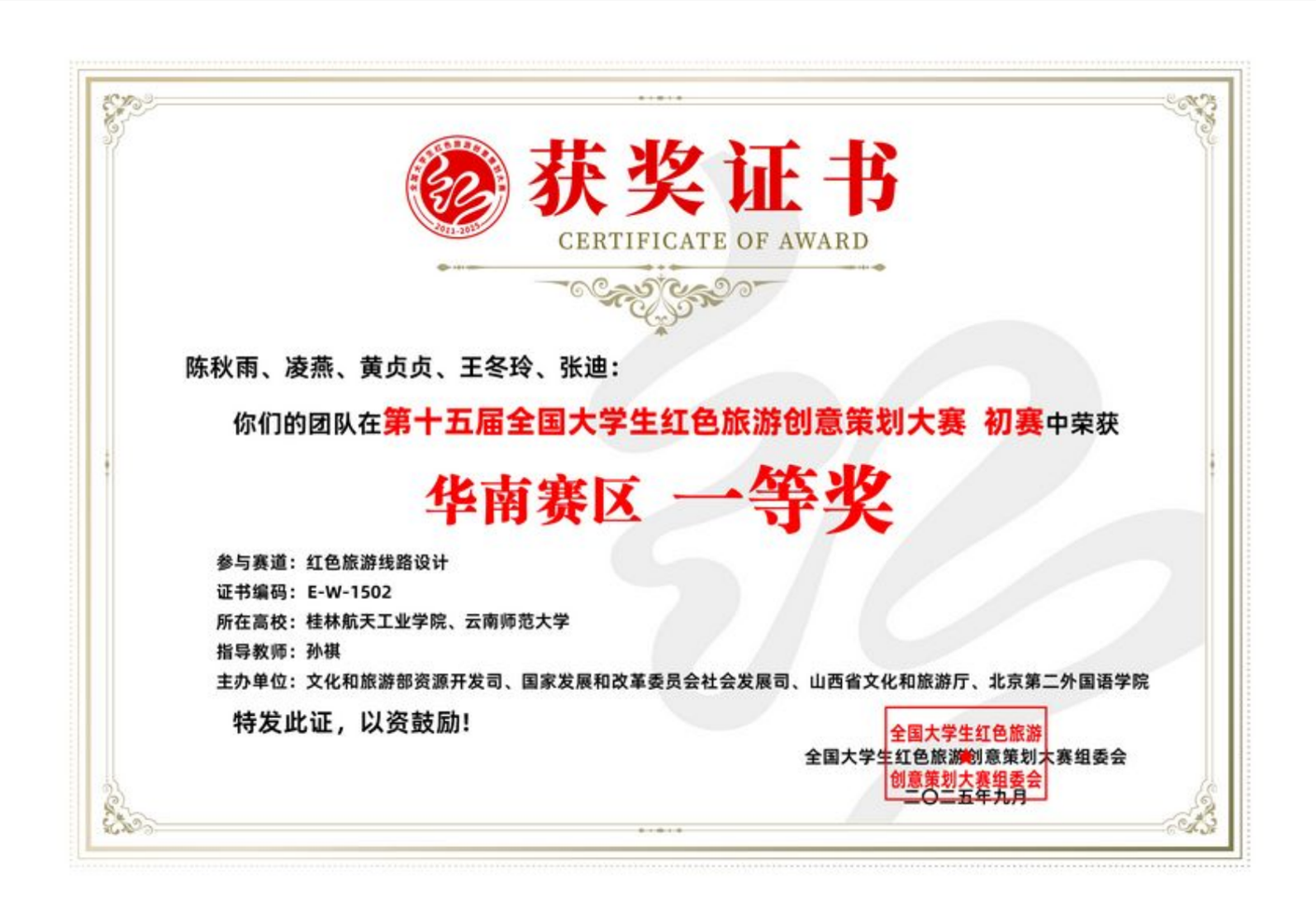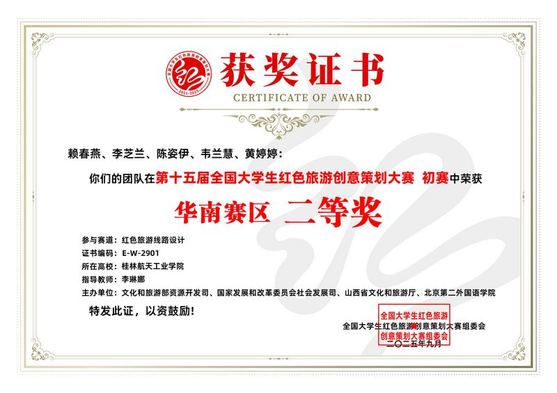 近日,第十五届全国大学生红色旅游创意策划大赛圆满落幕。本届大赛以“铸就红色理想,书写创意青春”为主题,由文化和旅游部资源开发司、国家发展和改革委员会社会发展司、山西省文化和旅游厅、北京第二外国语学院联合主办。本届大赛自2025年4月启动,吸引了全国1001所高校、6002支队伍、3万余名师生参加。经过6个月的角逐,我院酒店管理专业共6支团队在红色旅游线路设计赛道获得华南赛区一等奖1项、二等奖5项。