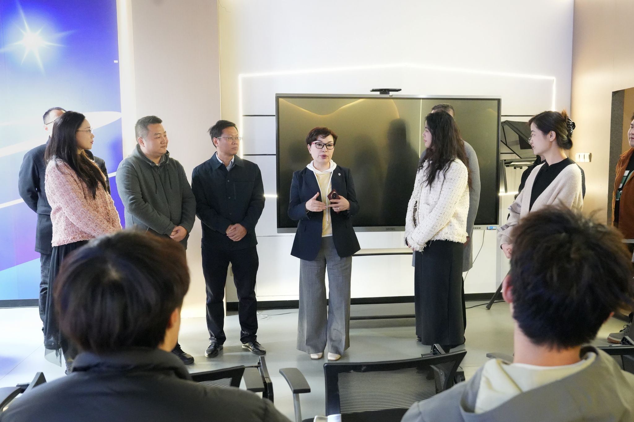 讲座结束后,李瑞英老师前往航空服务与旅游管理学院参观播音与主持艺术专业实验室,并与师生互动交流。她以生动鲜活的案例,详细地讲解了如何在不同场景下运用有声语言更好地表达,鼓励大家要珍惜宝贵的实践机会,将理论知识与实际操作紧密结合,在反复练习中打磨专业技能,不断提升自身的综合竞争力。现场气氛热烈而融洽,同学们纷纷表示,李老师的指点精准独到,让大家受益匪浅。