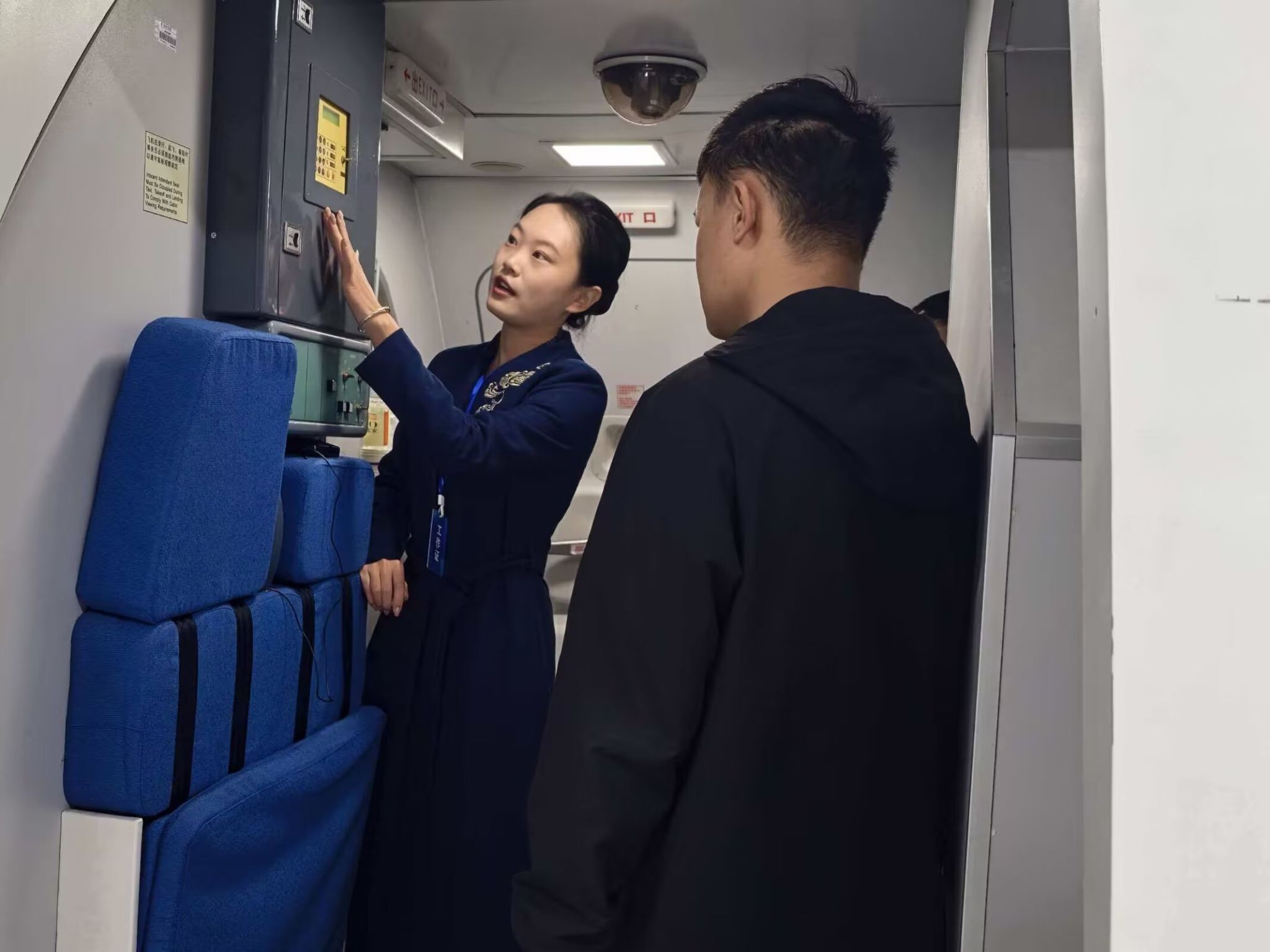 本次活动核心环节为“模拟客舱实景互动”。主办方预先将安全须知卡、复古航空报刊、仿真登机牌等客舱元素布置于模拟舱的座椅袋及储物格等处,参与者以“客舱探秘者”的身份,在搜寻物品的过程中逐步了解客舱细节;同时,工作人员同步讲解客舱供氧设备、安全带及应急出口标识等设施的功能与使用规范,巧妙融合了趣味探索与知识普及。