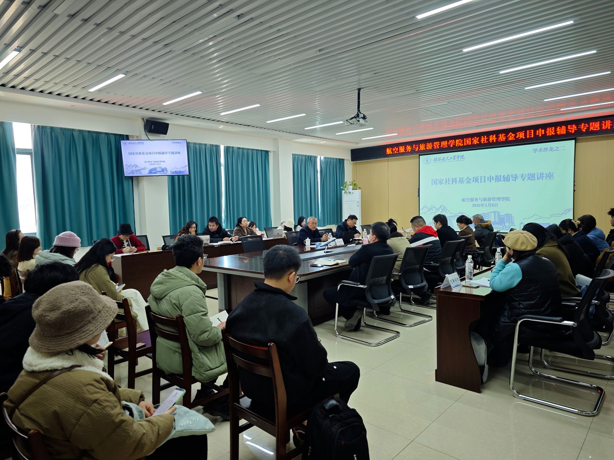 1月8日下午,学院邀请桂林理工大学二级教授、博士生导师吴忠军教授在探天C207会议室做国家社科基金申报辅导专题讲座。学院院长林朝阳、党委副书记张磊磊出席讲座,学院及兄弟学院教师代表60余人现场聆听了讲座,讲座由林朝阳主持。