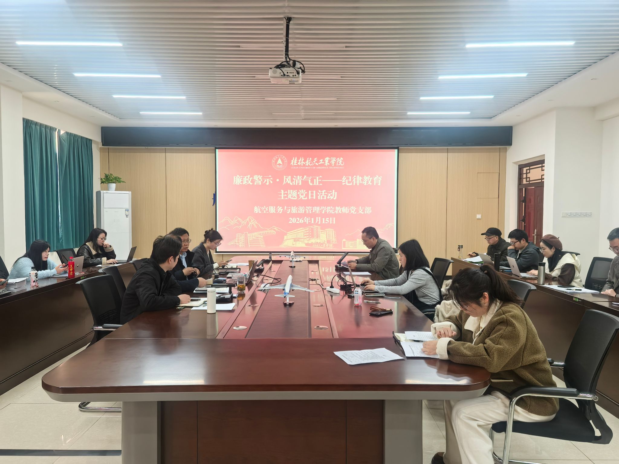 活动紧扣2026年春节前夕关键时间节点,旨在进一步严明纪律要求、筑牢廉政防线。会上,全体党员认真学习了上级关于加强春节期间廉洁自律工作的文件精神,听取了学院“清廉桂航”建设进展情况汇报,并集中观看了廉政警示教育片《永远在路上》精选片段。在随后开展的“以案说纪”专题讨论中,党员教师结合自身岗位实际,积极分享学习体会,交流廉洁从教、立德树人的思考与感悟。