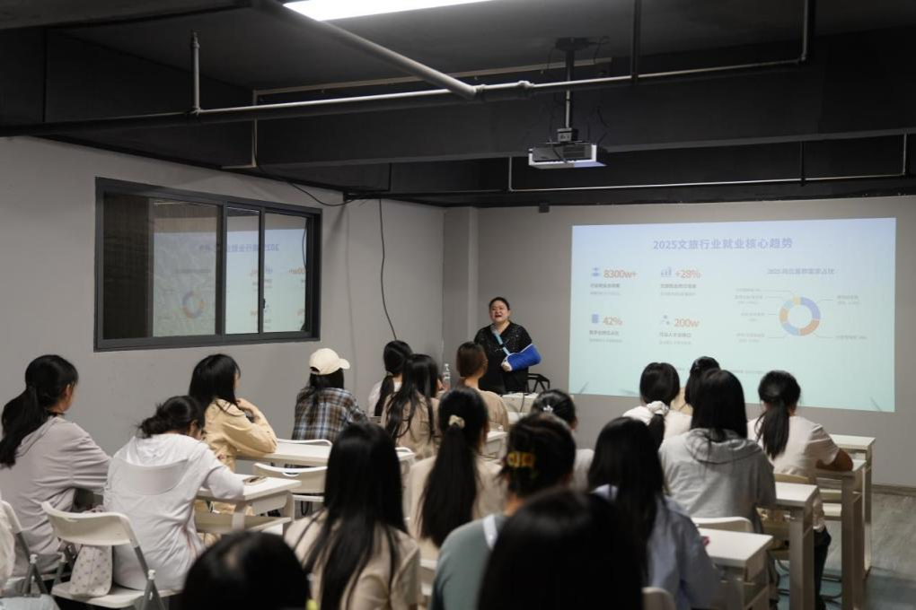 活动之初,公司相关负责人详细介绍了企业的发展历程、文化理念、业务板块及人才需求。在交流环节,负责人与同学们就“文旅人才供需形势”进行深入探讨。分享目前文旅行业在研学、文创、会展、数字内容等细分领域的岗位需求变化,鼓励同学们在校期间注重跨学科知识积累。